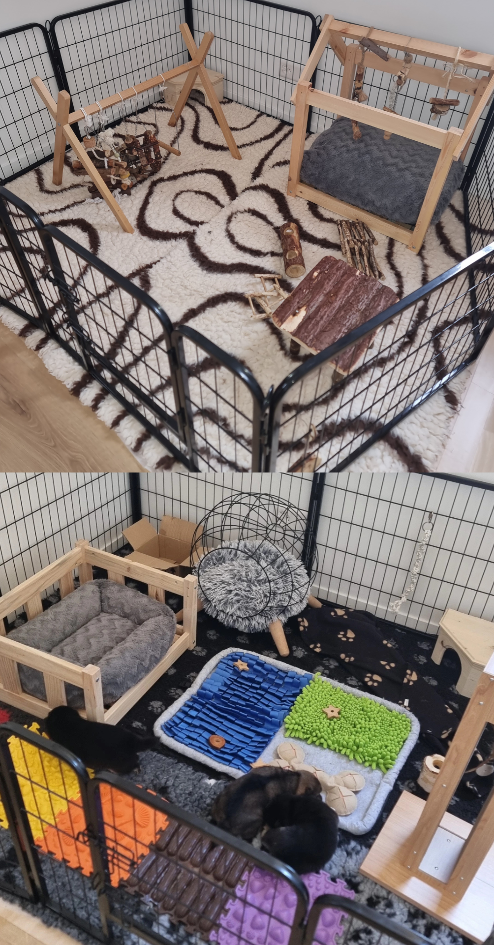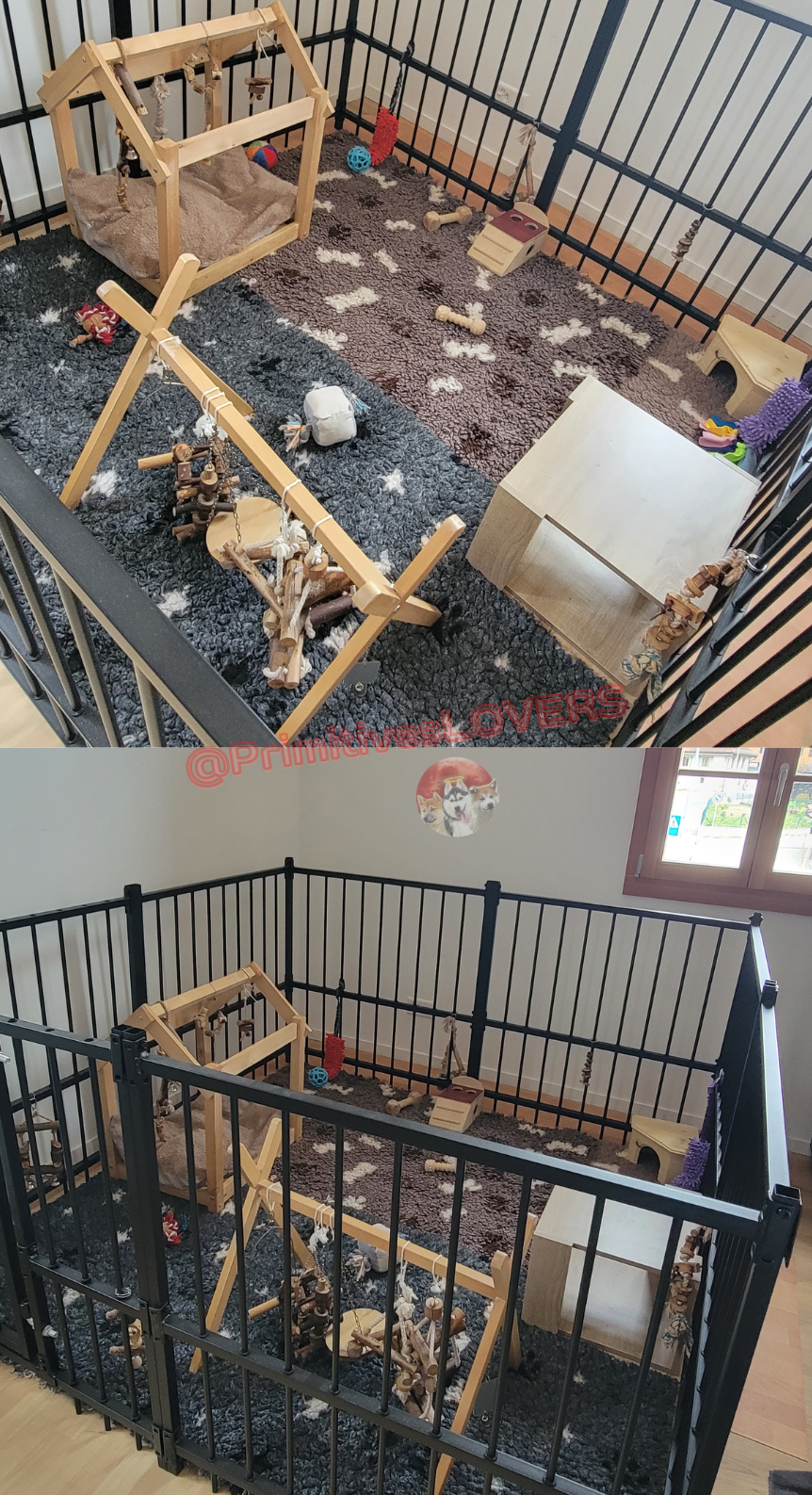 Nos chiots grandissent dans un environnement enrichi : un parc de jeux intérieur avec des jouets, de la musique, des objets du quotidien, des matériaux divers et des tunnels de jeu. Ces éléments ont été spécialement conçus pour les aider à se familiariser avec différents environnements et situations. Ils favorisent leur apprentissage, leur développement et leur motricité.